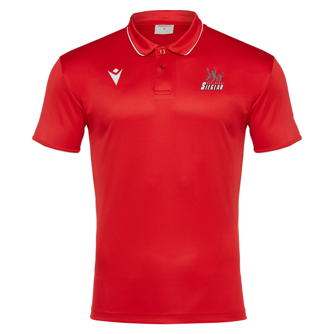 - rotes Macron Comedy ECO Polohemd mit kleinem Sieglarer TV Ballsport-Logo auf der Brust