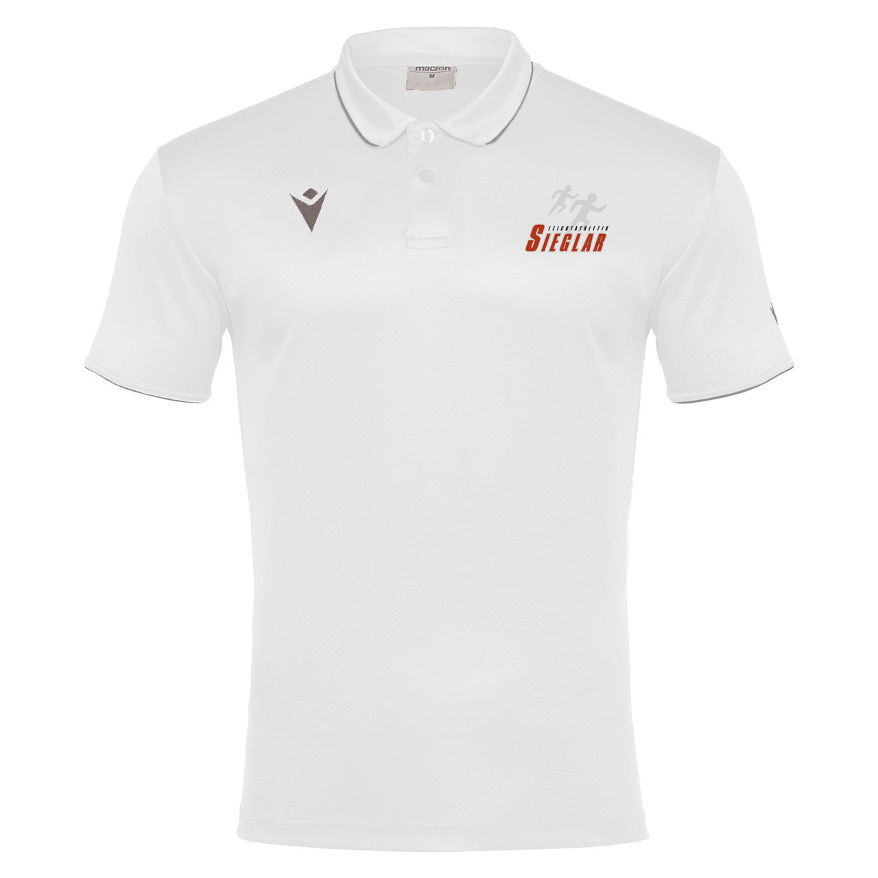- weißes Macron Draco Polohemd mit kleinem Sieglarer TV Leichtathletik-Logo auf der Brust